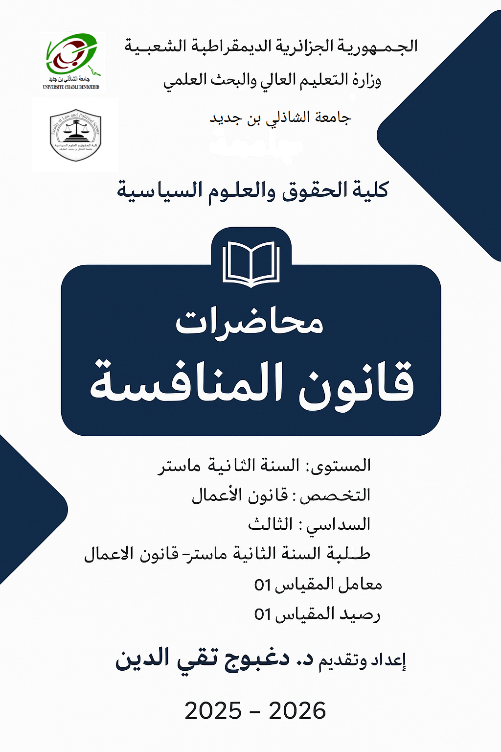 يعد مقياس قانون المنافسة من المقاييس الأساسية في تكوين طلبة السنة الثانية ماستر – تخصص قانون الأعمال، لما له من أهمية بالغة في فهم الإطار القانوني المنظم للسوق وضبط الممارسات التجارية بما يضمن حرية المنافسة ونزاهتها. يهدف هذا المقياس إلى تمكين الطالب من الإحاطة بالمفاهيم القانونية المرتبطة بالمنافسة الاقتصادية، والوقوف على الأسس النظرية والتطبيقية التي يقوم عليها قانون المنافسة في التشريع الجزائري.